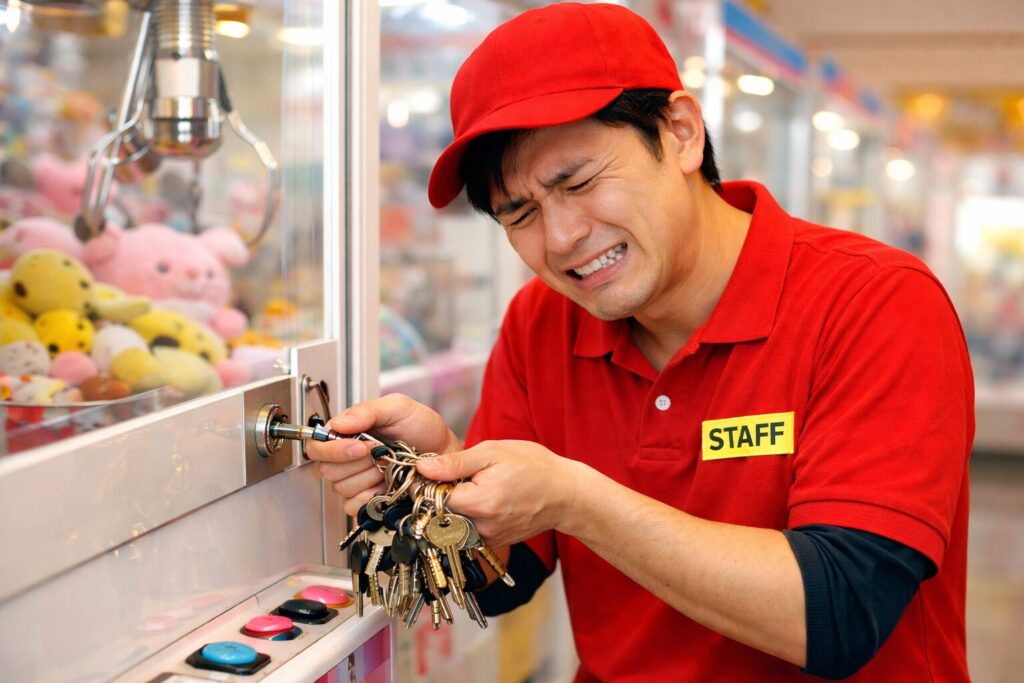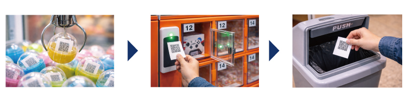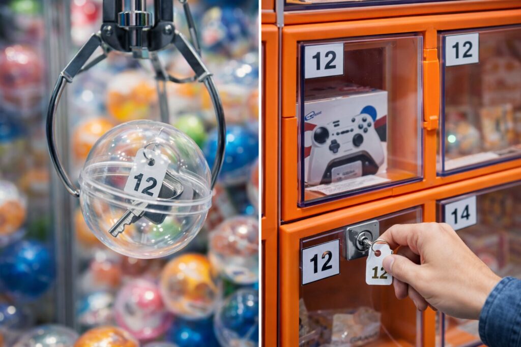 例えば、クレーンゲームでカプセルを獲得すると、中に番号付きの物理鍵が入っており、その番号に対応した商品扉を鍵で開けることで景品を受け取る仕組みがあります。